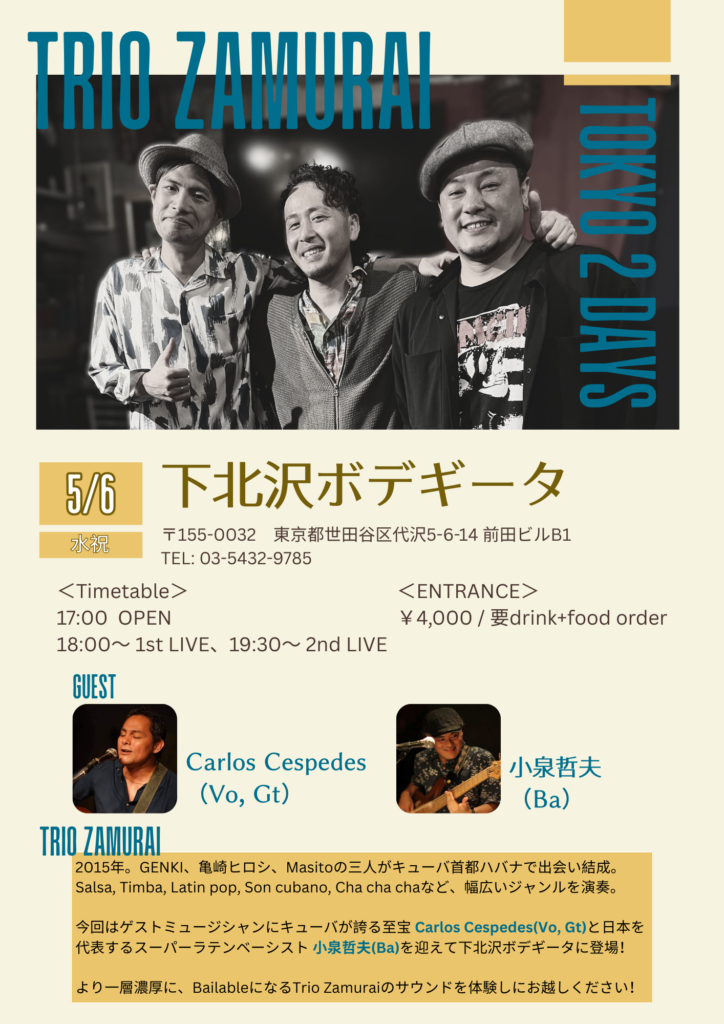 5月5日、5月6日の二日間の日程で【TOKYO 2 DAYS】を慣行!二日目となる5/6(水祝)は、ゲストミュージシャンにキューバが誇る至宝 Carlos Cespedes(Vo, Gt)と日本を代表するスーパーラテンベーシスト 小泉哲夫(Ba)を迎えて下北沢ボデギータに登場!より一層濃厚に、BailableになるTrio Zamuraiのサウンドを体験しにお越しください!- – – – – – – – – –